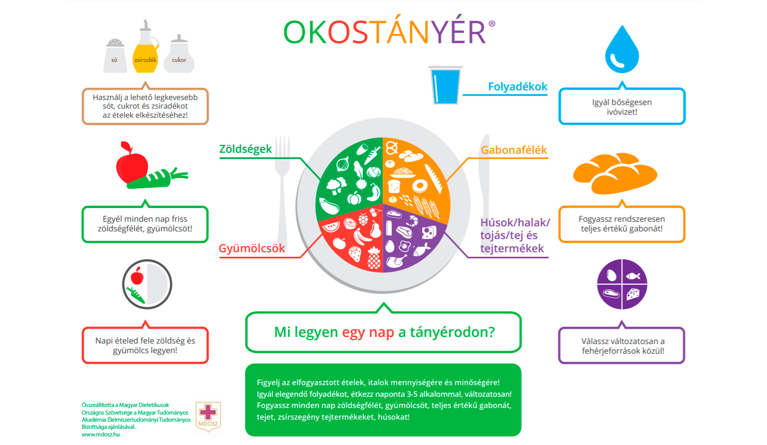 Erre az OKOSTÁNYÉR® szakmai ajánlás ad információt, mely egy tányér formán belül mutatja meg, hogy annak az egyik felén zöldség és gyümölcs legyen, a másik felén pedig a gabonafélék és a fehérjeforrások (hal, tej, tejtermékek, tojás, húsfélék) osztozzanak.
